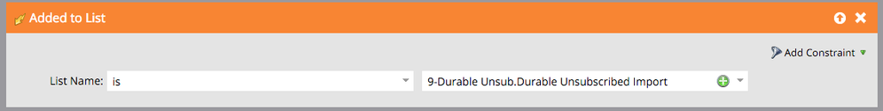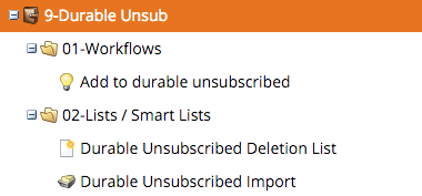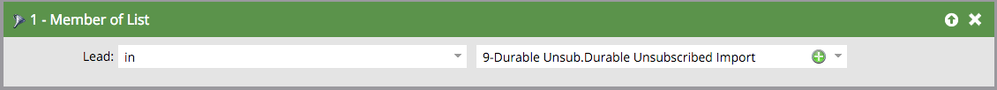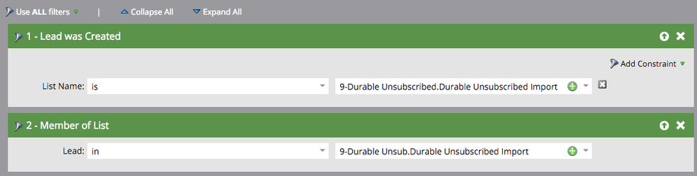 2. The "Durable Unsubscribed Deletion List" will contain all the leads that are unsubscribed but should not be kept in the database. In other words, they were added to Marketo when you imported leads to the Durable Unsubscribe Import list. It's filters are set as is :