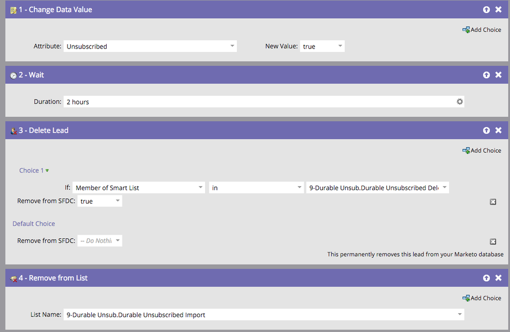 Then we wait 2 hours to leave Marketo ample time to log the un-subscription (We can even leave it 1 day, but do not make it too short). After this delay, we check the lead is still there, waiting for deletion and has been created during the import. For this, we check the lead still belong the the "Durable Unsubscribed Deletion List" smart list and, if so, we delete it.Finally, if the lead has not been deleted (meaning it was there already and is supposed to have some history in the database), we remove it from the Import List